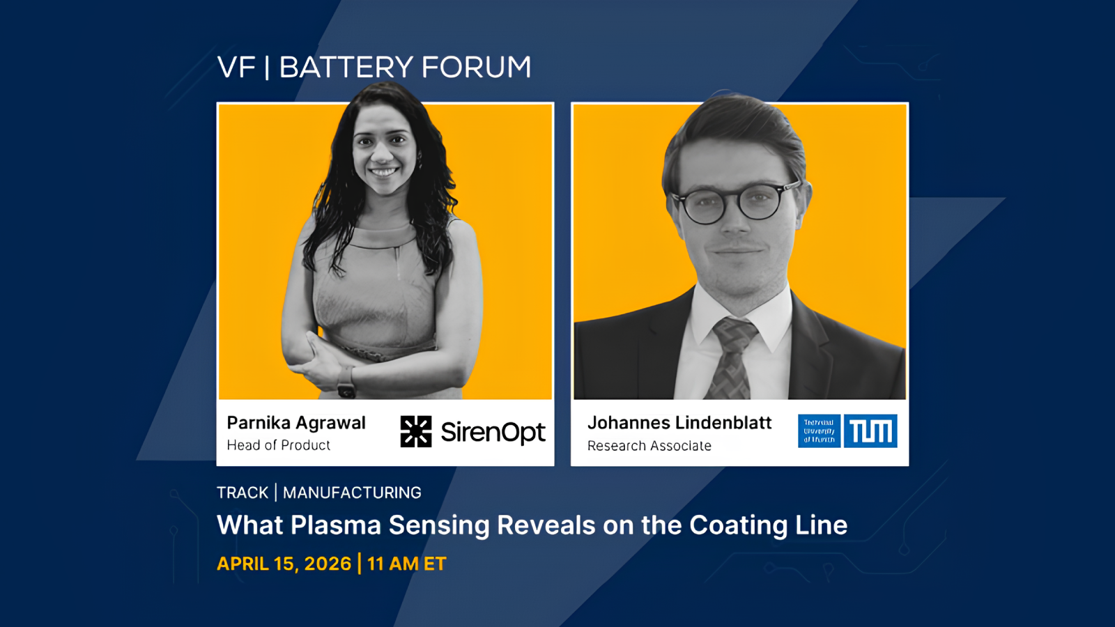 Parnika Agrawal (SirenOpt's Head of Product) and Johannes Lindenblatt (Research Associate at the Technical University of Munich) will be co-presenting "What Plasma Sensing Reveals On The Coating Line" during the Battery Forum (Volta Foundation) on April 15th at 8am Pacific time / 11am Eastern time / 17H CET.